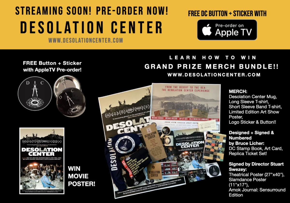 With live music on lockdown for the forseeable future, this is the perfect time to catch up on some amazing, rarely seen footage of legendary outdoor shows. Desolation Center is the untold story of a series of guerrilla music and art performance happenings in the 80s which inspired the birth of contemporary festival culture including Burning Man, Lollapalooza, and Coachella. The documentary (originally released in November 2019, and clocking in at 94 minutes in length) combines interviews of punk and post-punk luminaries with rare performance footage of Sonic Youth, Minutemen, Meat Puppets, Perry Farrell, Redd Kross, Einstürzende Neubauten, Survival Research Laboratories, Savage Republic and more, giving viewers unprecedented access to a time when pushing the boundaries of music, art, and performance was like an unspoken obligation. On Tuesday, June 23rd the film will be available digitally everywhere and the producers are giving people an added incentive to order early. They are giving away a Desolation Center button + sticker for every Apple TV / iTunes pre-order, plus a chance to win a signed movie poster or a massive merch bundle. See below and visit www.desolationcenter.com for complete details. |