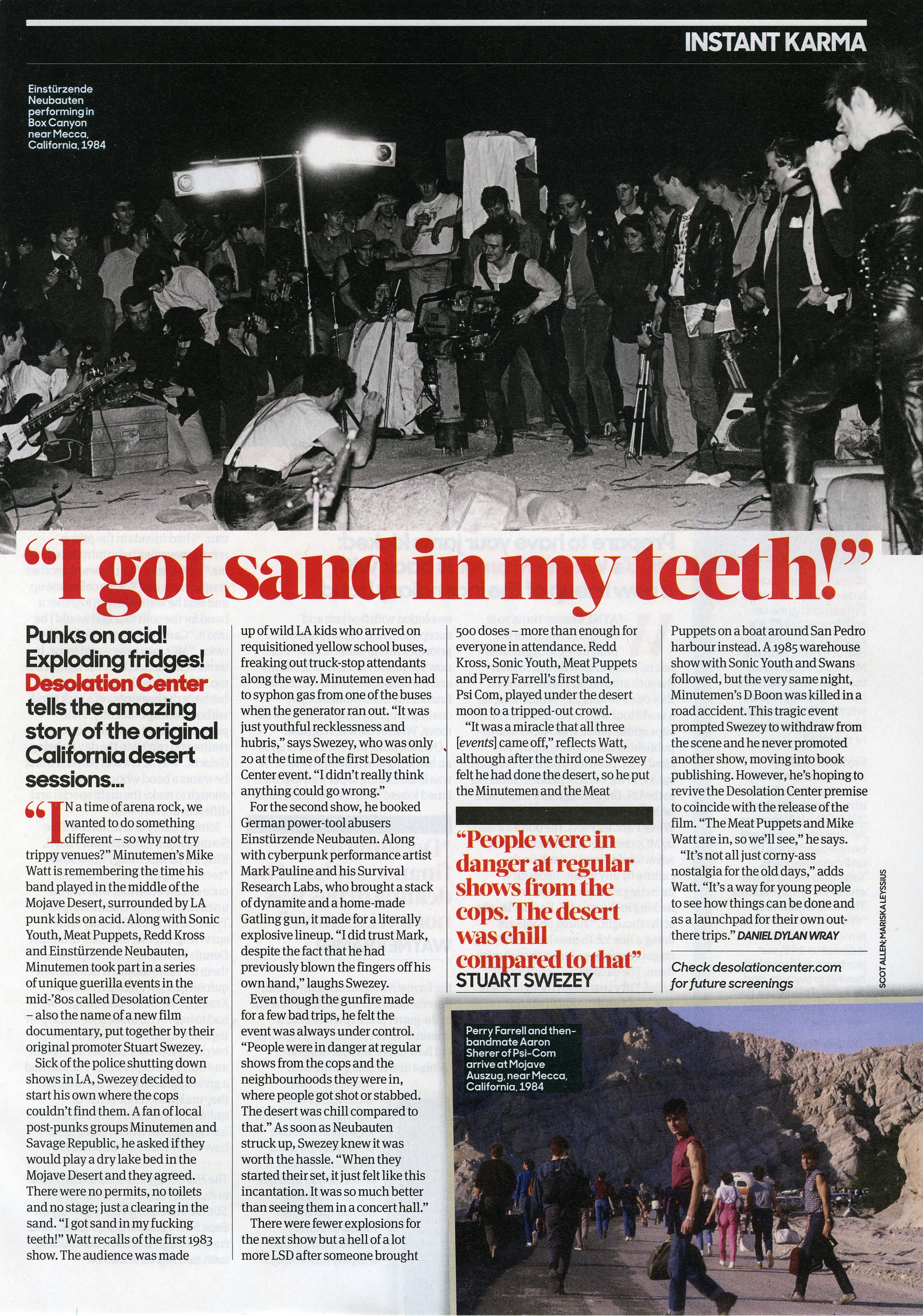 "The Desolation Center shows managed to avoid the pivotal moment when festivals for the counterculture shift and become mainstream, inevitably altering their feel and purpose. In some ways, the magic of the shows is that they never had a chance to become diluted by money or time: they were raw, they were real, and, most importantly, they were completely original." "A fascinating glimpse at the emergence of a phenomenon" Kim Gordon (from her book Girl In A Band: A Memoir): "We played in the middle of the Mojave Desert at a festival called Gila Monster Jamboree ... It was a magical night, one of my favorite shows ever. " "Stuart Swezey's important and electrifying documentary recounts the chaotic birth of what he dubbed the (now legendary) "Desolation Center" concerts-cum-happenings-cum-anarchy-crazed outings into the far backcountry of the Mojave Desert. They lasted for just two years but laid the foundations for those aforementioned music and art gargantuas. . . . Desolation Center illuminates a short-lived but absolutely momentous time when the Mojave beckoned, free of charge and front-loaded with anarchic artistic overload. Watching Sonic Youth blaze through their song "Death Valley 69" against the backdrop of disorganized yet ecstatic chaos, you're reminded that these desert micro-tests once upon a time had real teeth and zero air-conditioned VIP tents." "The greatest compliment one might pay Desolation Center is this: it somehow manages, against almost impossible odds, to capture the power of events that revolutionized pop music as we knew it. To watch director Stuart Swezey's essential documentary is to marvel at a dust-grimed Sonic Youth ripping through "Death Valley '69" in the California desert long before anyone had heard of Coachella. It's to sit there slack-jawed at the insanity of the Meat Puppets, caught losing their shit on a boat cruise a decade before Kurt Cobain tried to make them a household name with MTV Unplugged in New York. And it's to understand not only the revolutionary power of German noise pioneers Einstürzende Neubauten as they turn sheet metal into sonic art, but also the seeds of multimedia blowouts like Burning Man." "Between the utopian music festivals of the late 1960s and the corporate behemoths they've become, a series of site-specific concerts in Southern California once offered an alternative, wildly independent vision of what these types of events could be." "Continuing the DIY spirit of early California punk, Swezey set out to keep an emerging genre of alternative music out of nightclubs and inside mysterious warehouses and rehearsal places. This was in accordance with the principles of what would become known as Desolation Center, a consortium of post-punk aficionados who resisted the concept of money-making in favor of truly egalitarian experimental live shows with no guest lists, no paid advertising, and no solicitation of the press." Red Bull Music Academy interview RIOTFEST Interview PLEASE KILL ME Interview |
